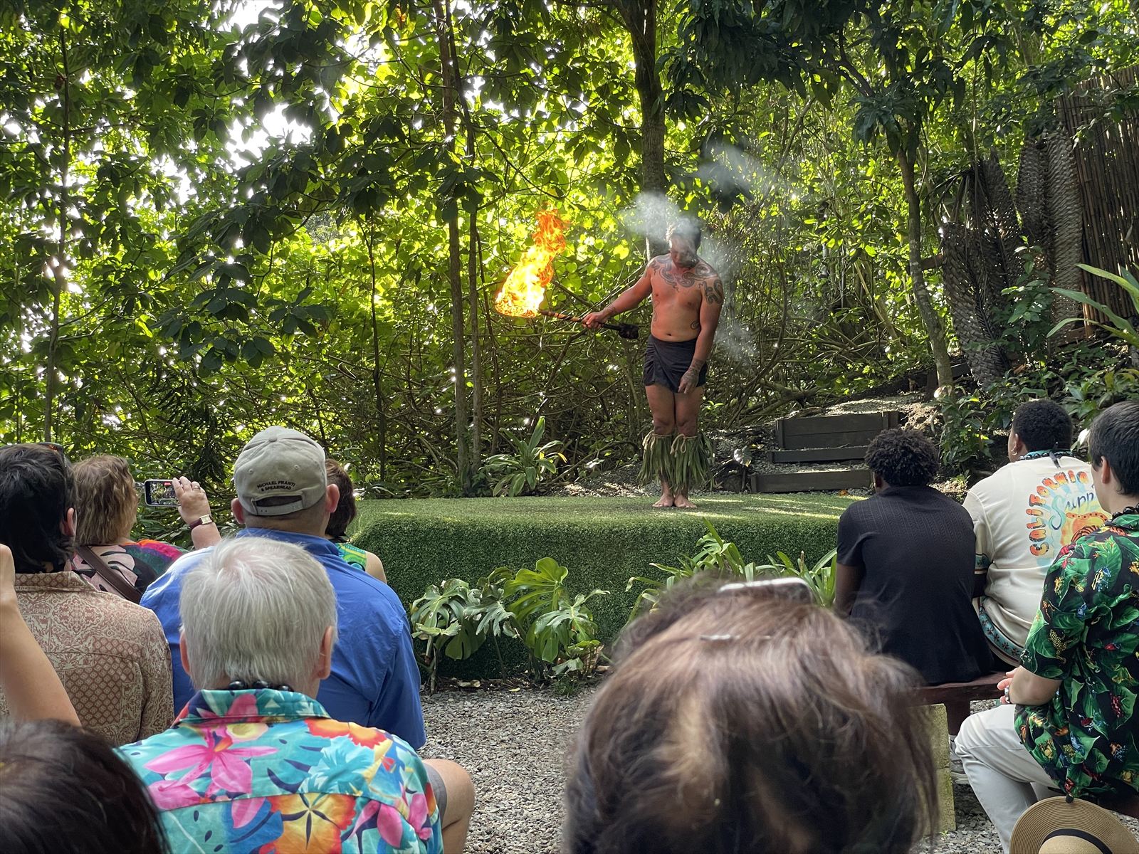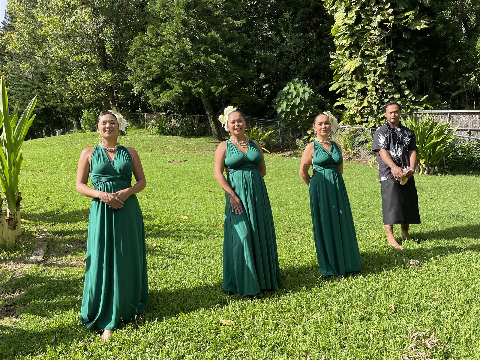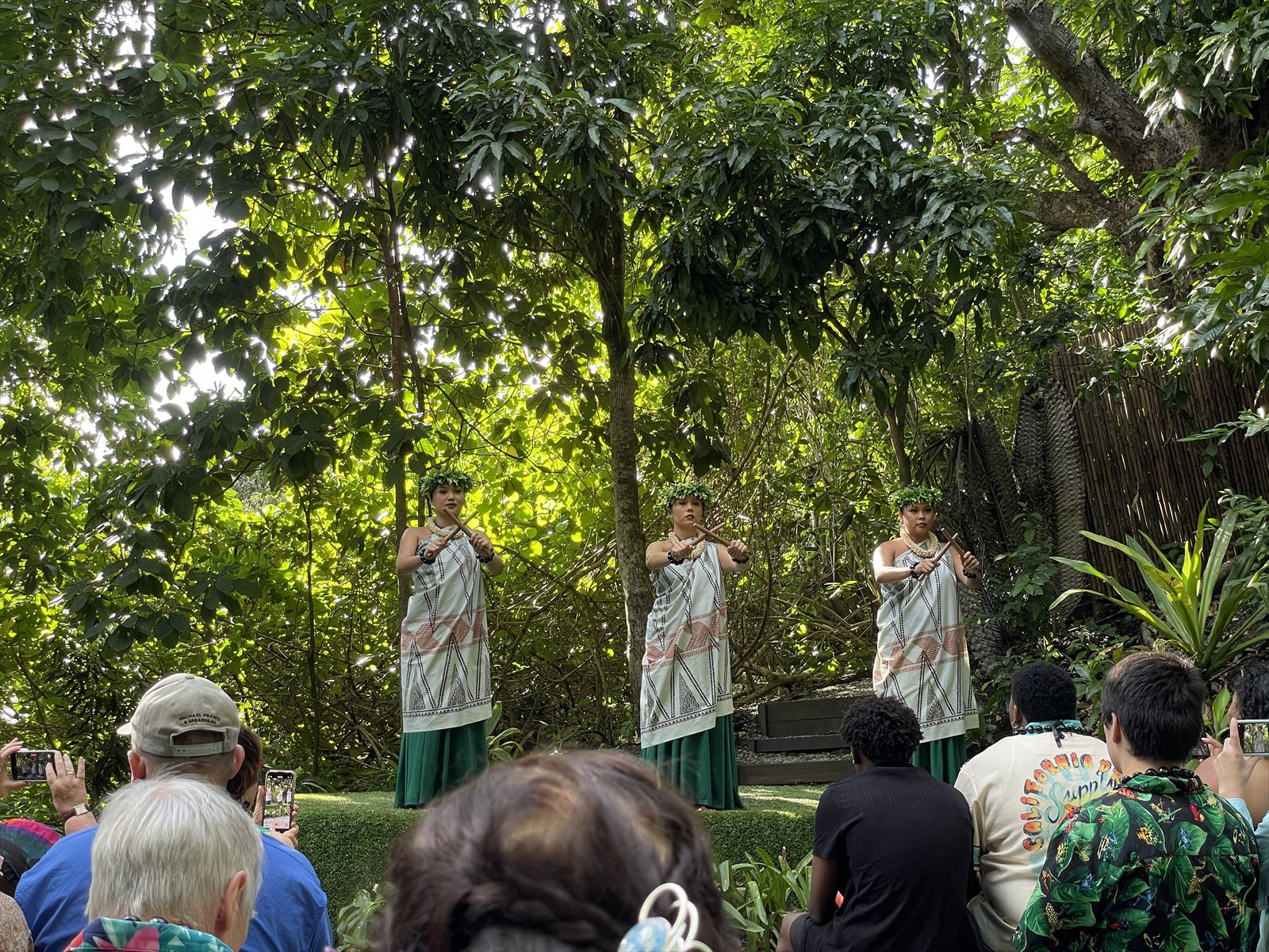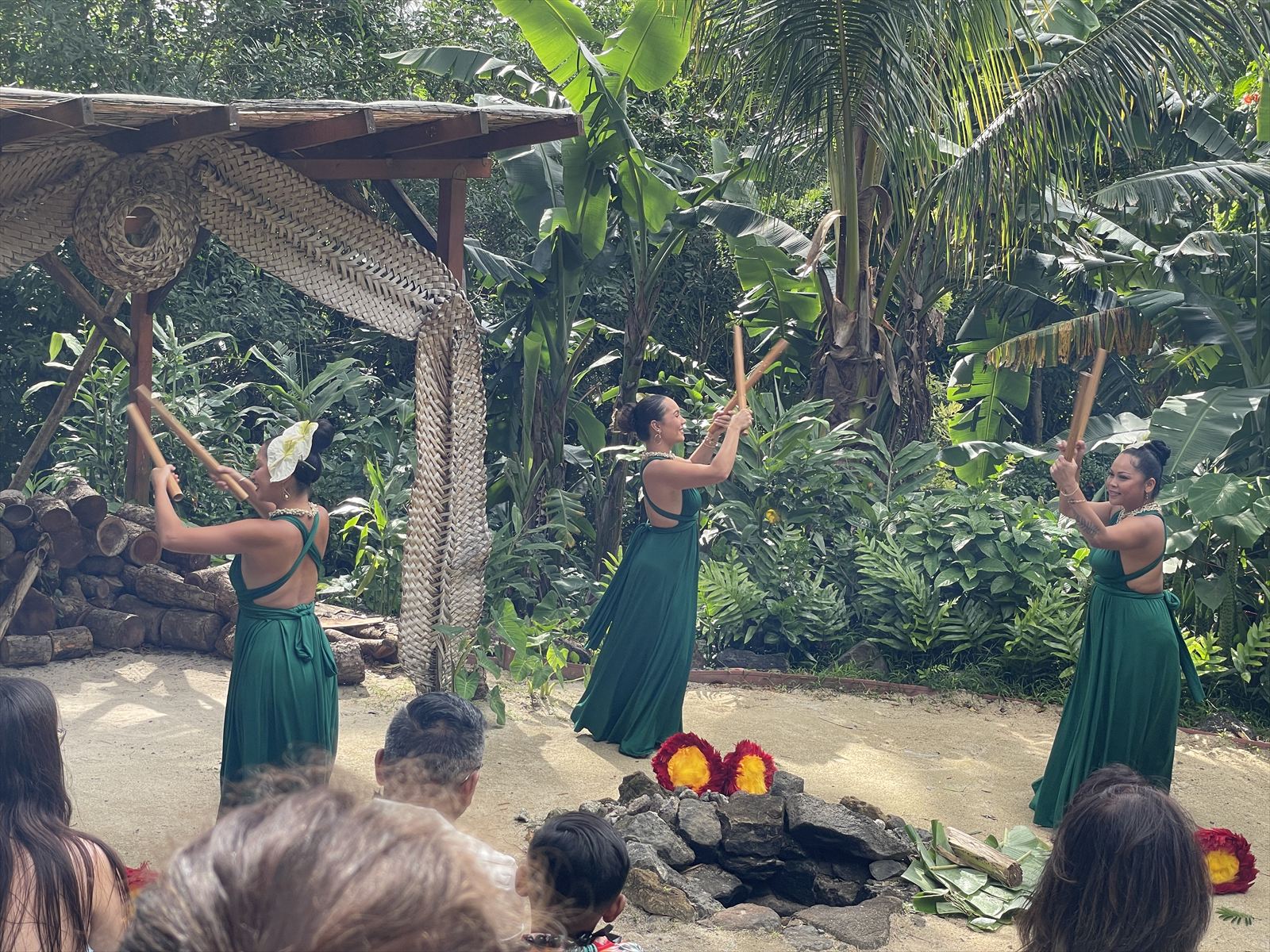 農園では場所を代えて、いろいろなダンスを見せてくれました。食事が始まる前の時間は広場のようなところではハワイの古典的な遊びを体験しました。