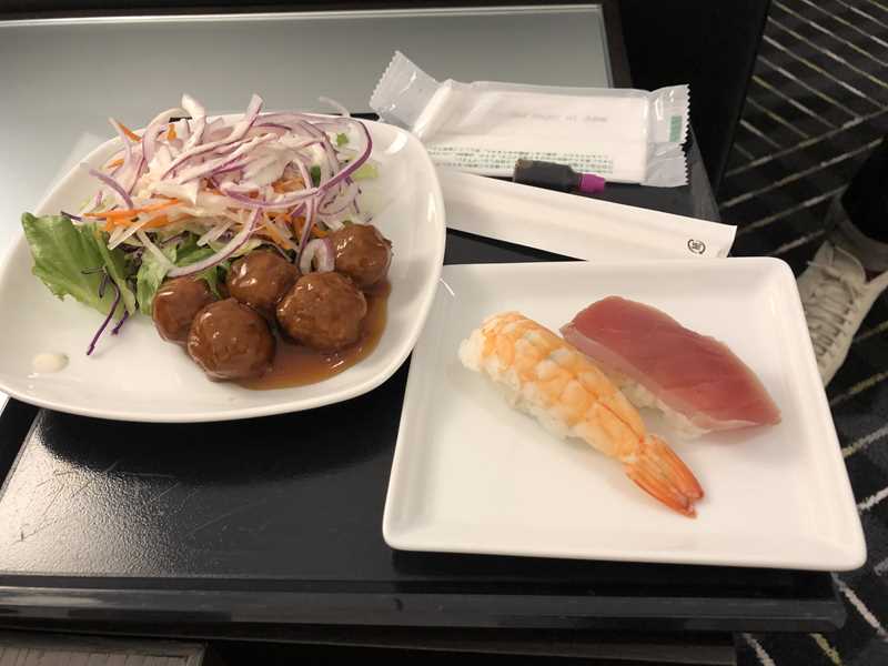 ゴールデンウィーク明けの平日のせいか、チェックインカウンターもラウンジもすいていました。ラウンジでは、おすしのサービスがあり、ゆっくりビールを飲んで過ごしました。ビジネスクラスの食事が待っているので控えめにしました。
