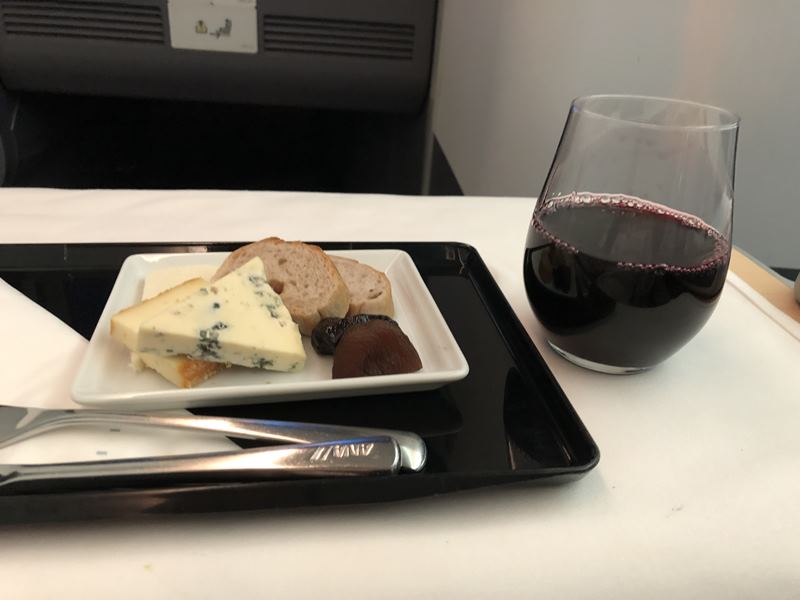 食後は、赤ワインとチーズの盛り合わせをいただきました。メニューに、特選のワインがのっていて、何がでるかは当日CAさんに尋ねると分かるようになっているようでした。当日は赤ワインということだったので、チーズの盛り合わせと一緒にお願いしました。