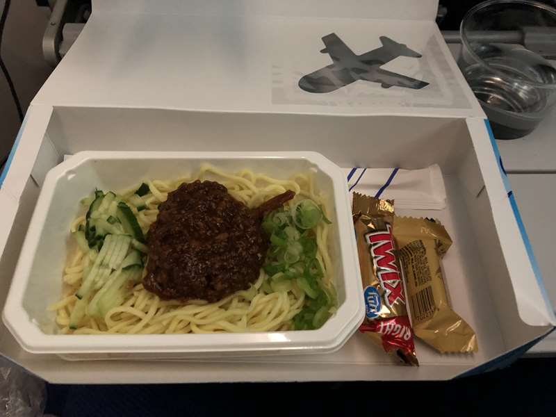 到着間近の食事は、こんなかわいいパッケージのジャージャー麺でした。ちょっと味が濃い感じでした。