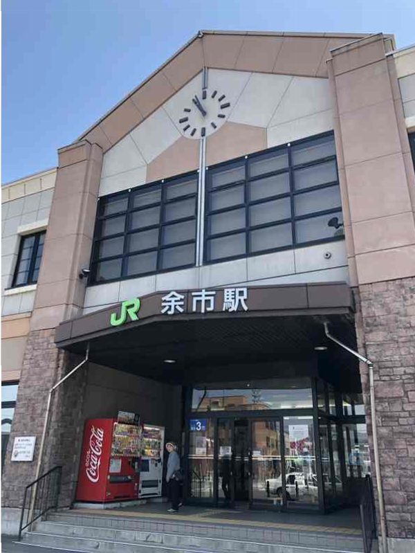余市駅前の停留所で降車します。駅から余市蒸留所の門が見えます。