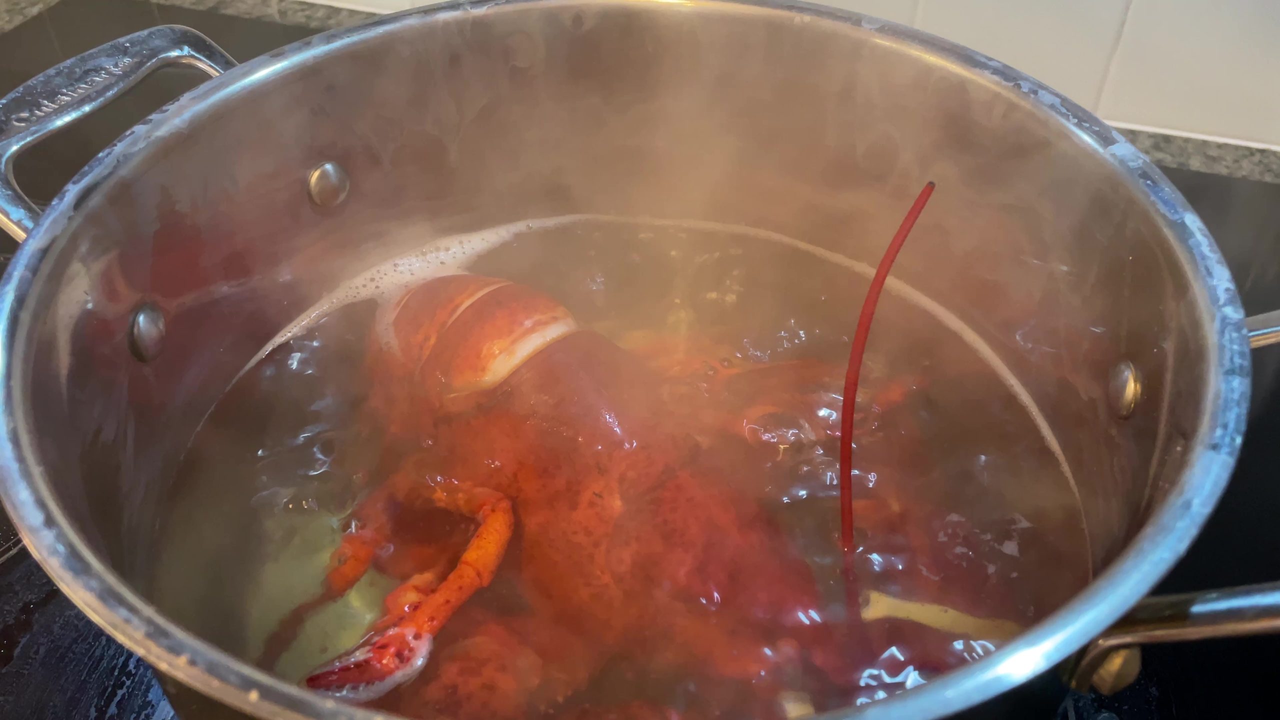 2.ロブスターはあらかじめ洗っておき、湯が沸騰したらロブスターを入れる。(15分間)